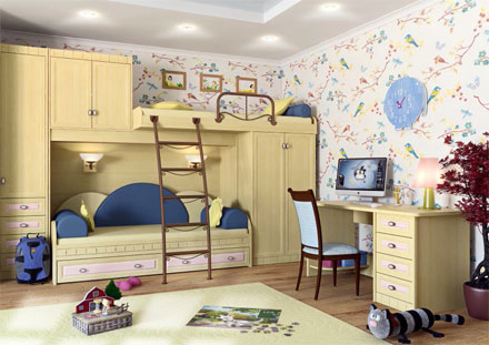 51.201.09 Шкаф однодверный — 1 шт. 51.105.01 Кровать 2х-ярусная — 1 шт. 51.101.02 Кровать тахта — 1 шт. 51.501 Стол — 1 шт.