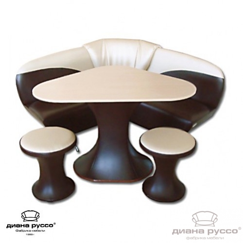 Обеденная зона с необычным дизайном. Размеры дивана, который может быть выполнен как с правым, так и с левым расположением угла, могут быть различными. Диван выпускается в одном типаразмере: 125 сантиментов в зависимости от пожеланий заказчика. Обивка пуфов, дивана а так же опоры стола может быть выполнена как из кожзаменителя семи контрастных цветов, так и из ткани.