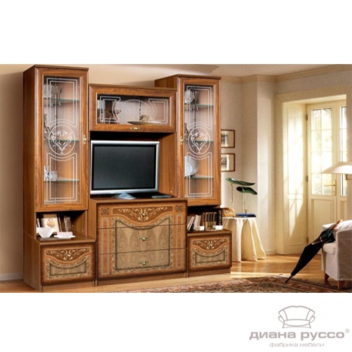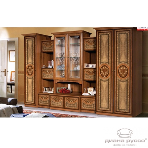 Стенка «Карина-1» необычайно красива, с уверенностью можно утверждать, что данная модель станет великолепным украшением гостиной комнаты, интерьер которой решен в классическом либо даже в дворцовом стиле. Применение экошпона с рисунком, нанесенным методом шелкографии на фасадах, имитирующим инкрустацию ценными породами дерева, создает неповторимый визуальный образ.